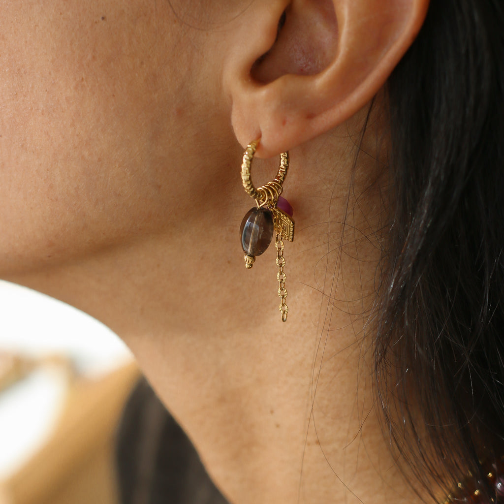 Vous pouvez porter ces boucles d'oreilles de plusieurs manières différentes, avec ou sans les pierres et choisir les pampilles que vous voulez sur les anneaux en les enfilant dessus.