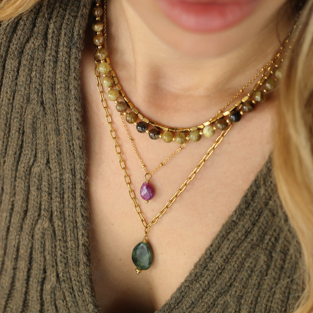En Acier inoxydable et pierres fines naturelles, ce collier ne craint pas l'eau, la douche. Le bijou parfait pour vous suivre tous les jours sans inquiétude.