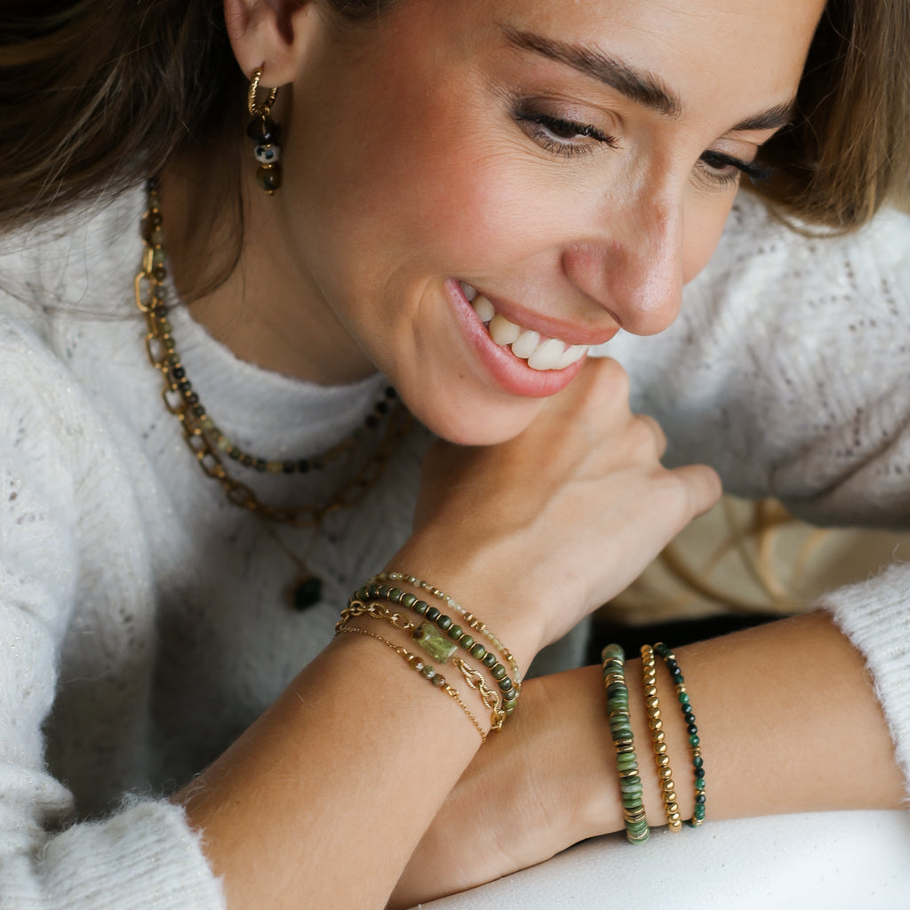 En Acier inoxydable et pierres naturelles, ce bracelet ne craint pas l'eau, la douche. Le bijou parfait pour vous suivre tous les jours sans inquiétude.